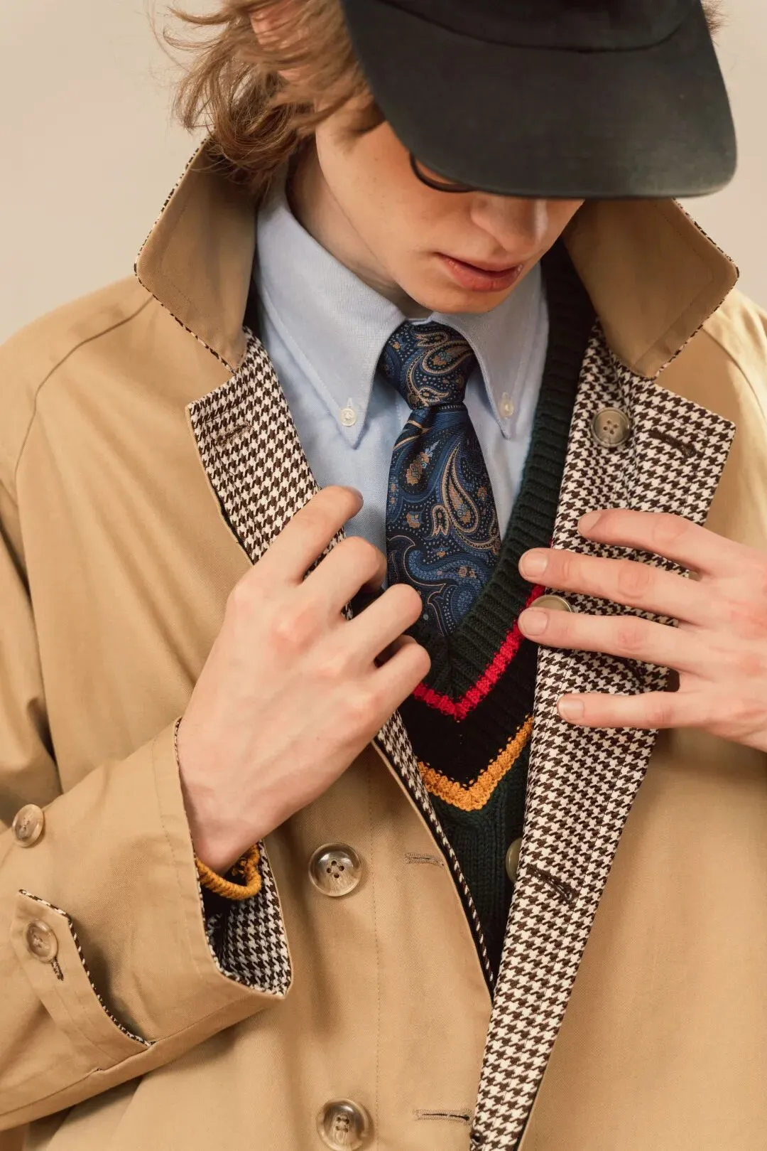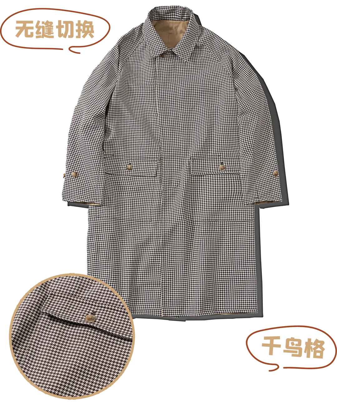 遵照这个规则,KUFFYLINK 大衣卡其色那面,就是大家熟悉的纯棉嘎巴甸防水面料(诞生于 19 世纪的传统风衣面料);另一面,则是采用了毛呢质感的千鸟格面料,因为考虑到了可水洗的便利性,所以就没使用含有羊毛的面料(脏了的话,直接洗就完事了)。