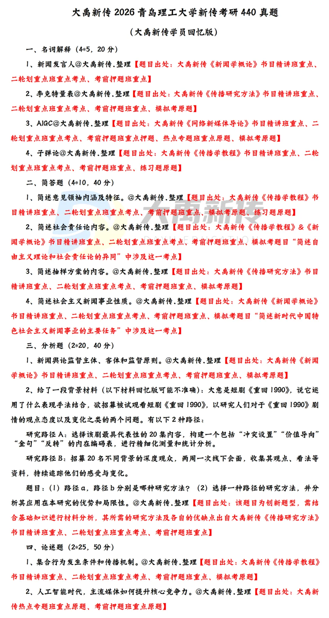在刚刚过去的2026考研初试里,作为全网独家系统化开设青岛理工大学新传考研辅导小班的机构,@大禹新传在 2026 青岛理工大学新传考研中再创佳绩 ——辅导内容覆盖其中原题 260 分(除1道40分策划实务未讲过原题),且绝大多数题目为模拟考原题或模拟考所涉及考点!@大禹新传 深耕新闻与传播考研领域多年,凭借对各院校考情的深入分析和命题规律的精准把握,打造出一套针对性极强的考研备考辅导体系,助力考生找准复习方向,高效备考。
