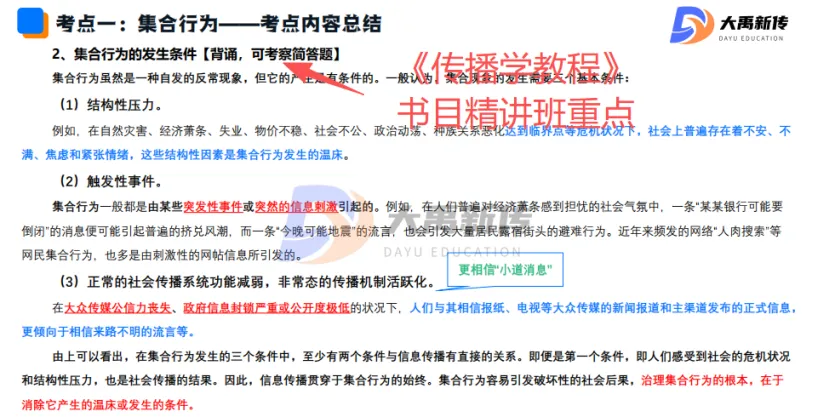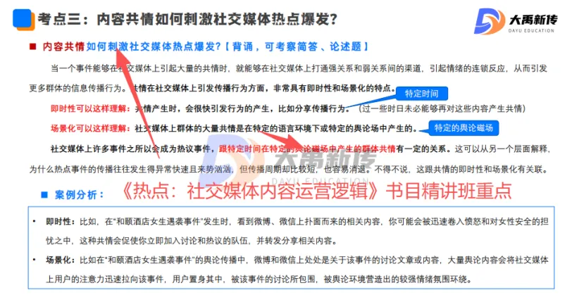 【题目出处:大禹新传《热点:社交媒体内容运营逻辑》书目精讲班重点、二轮划重点班重点考点、模拟考题目“简述“共情”在群体传播中的作用”中涉及这一考点】