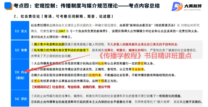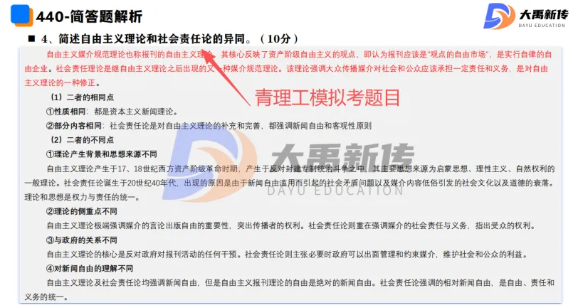 【题目出处:大禹新传《传播学教程》&《新闻学概论》书目精讲班重点、二轮划重点班重点考点、考前押题班重点、模拟考题目“简述自由主义理论和社会责任论的异同”中涉及这一考点】