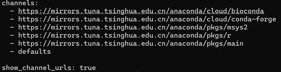 conda config --add channels https://mirrors.tuna.tsinghua.edu.cn/anaconda/pkgs/mainconda config --add channels https://mirrors.tuna.tsinghua.edu.cn/anaconda/pkgs/rconda config --add channels https://mirrors.tuna.tsinghua.edu.cn/anaconda/pkgs/msys2conda config --add channels https://mirrors.tuna.tsinghua.edu.cn/anaconda/cloud/conda-forgeconda config --add channels https://mirrors.tuna.tsinghua.edu.cn/anaconda/cloud/biocondaconda config --set show_channel_urls yes