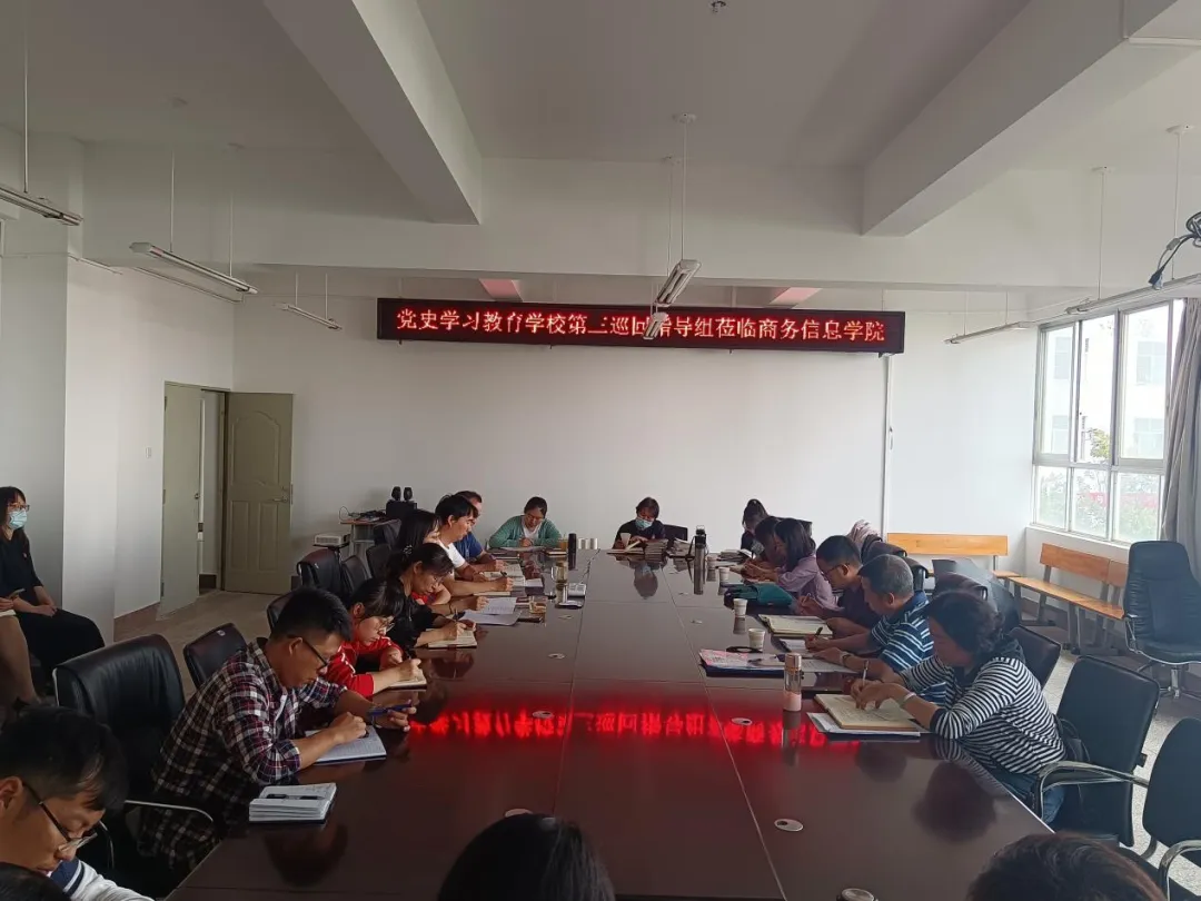 2021年9月3日上午,校党史学习教育巡回指导组第三指导小组组长秦忠同志率小组成员汪亚男、朱庭欣、唐娇、李洪香、廖术龙,以及联络员徐蓉等同志到经开校区对商务信息学院党史学习教育开展情况进行巡回检查。