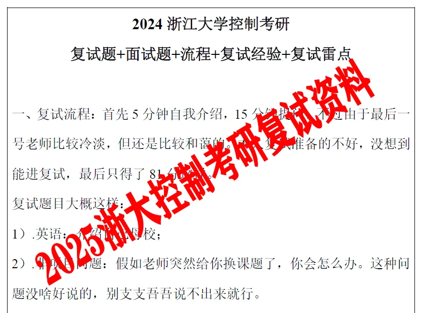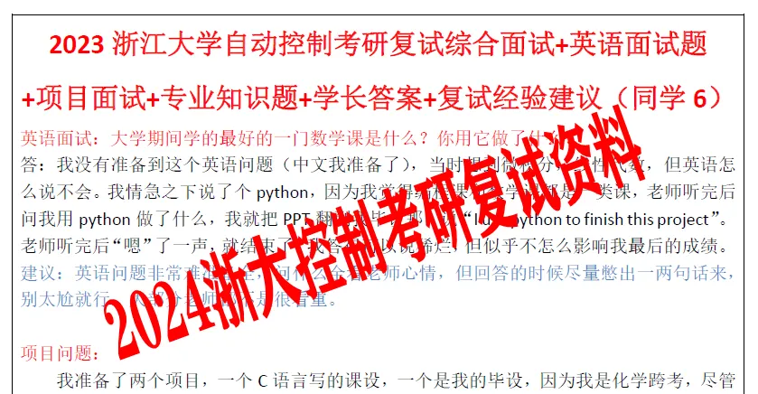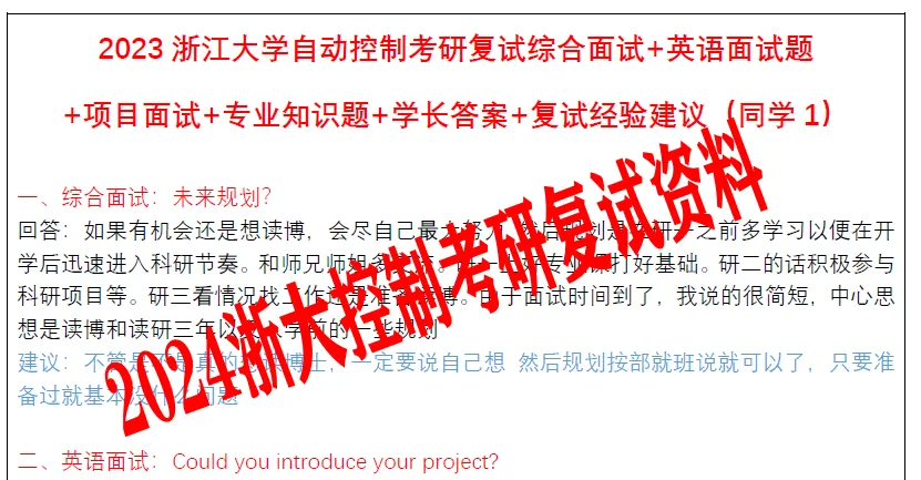 5,2023浙江大学自动控制考研复试综合面试+英语面试题+项目面试+专业知识题+学长答案+复试经验建议(上岸学长1)6,2023浙江大学自动控制考研复试综合面试+英语面试题+项目面试+专业知识题+学长答案+复试经验建议(上岸学长2)7,2023浙江大学自动控制考研复试综合面试+英语面试题+项目面试+专业知识题+学长答案+复试经验建议(上岸学长3)8,2023浙江大学自动控制考研复试综合面试+英语面试题+项目面试+专业知识题+学长答案+复试经验建议(上岸学长4)9,2023浙江大学控制考研复试题+面试题+流程细节+复试经验贴(上岸学姐5)10,2023浙江大学控制考研复试题+面试题+学长回答+流程细节+复试经验贴(上岸学长6)