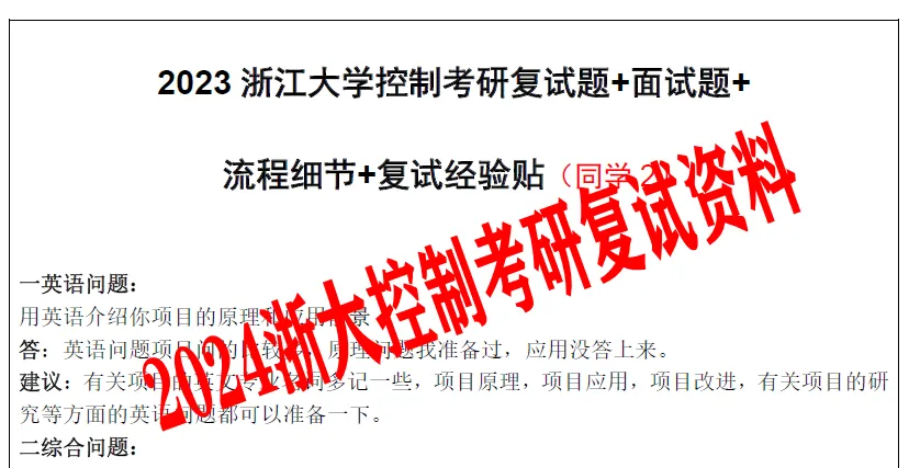 对多年来浙大控制复试每组题目以及每个老师的考题进行了整理和汇总,足足有三十多页,十分齐全,很珍贵!可以说是一个详细的浙大复试题库!为了复试保险,最好认真复习此项。