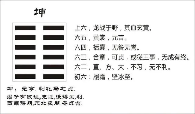 坤,元,亨,利牝马之贞,君子有攸往。先迷后得。主利西南得朋,东北丧朋。安贞吉。