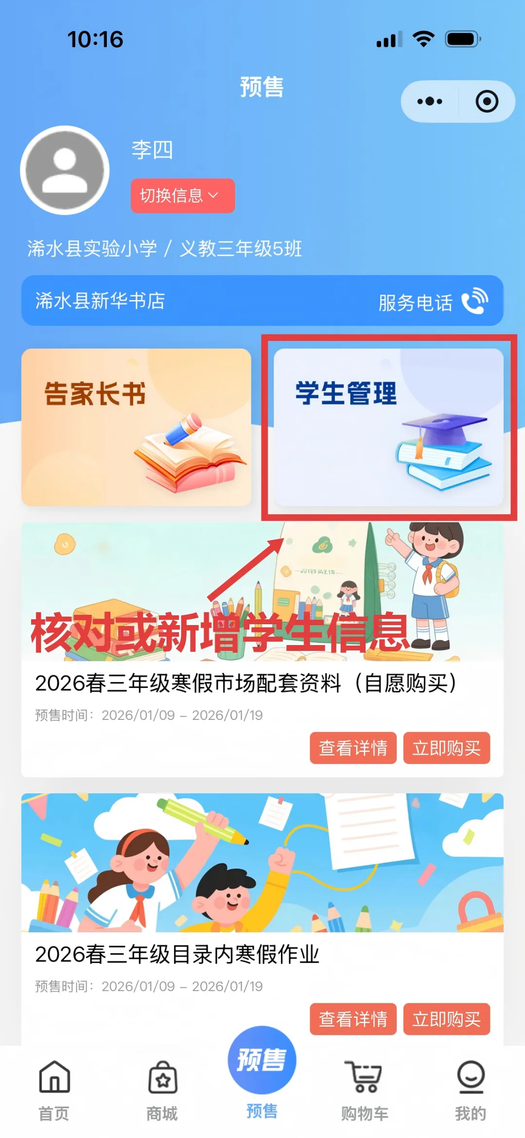 扫描各学校“倍阅学习中心”二维码或微信搜索“倍阅学习中心” → 点击屏幕上方登录 → 勾选“我已阅读并同意用户协议和隐私政策”并点击“登录” → 返回首页点击预售→ 核对或新增学生信息