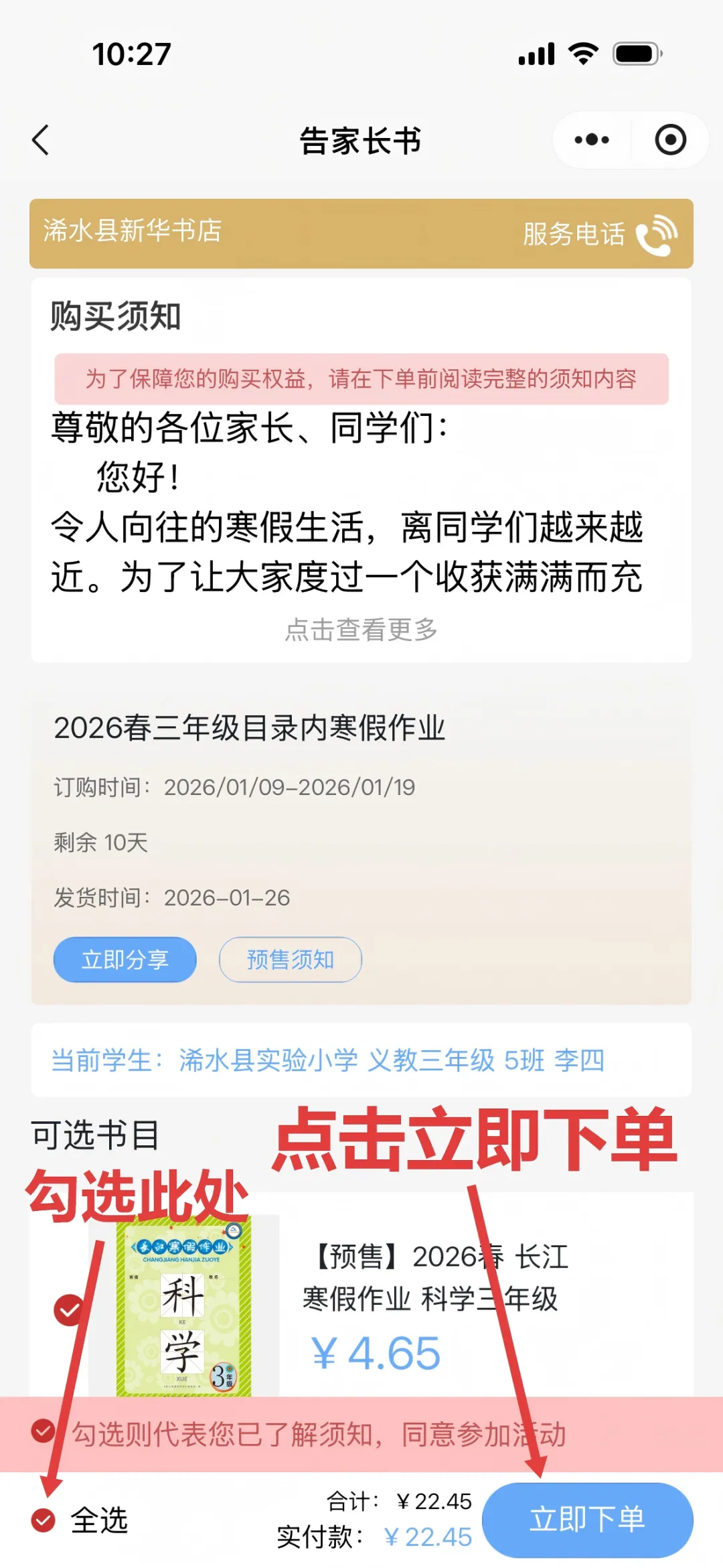 点击进入预售界面 → 点击所需学习资料 → 勾选已读须知 → 点击立即下单购买→ 完成支付