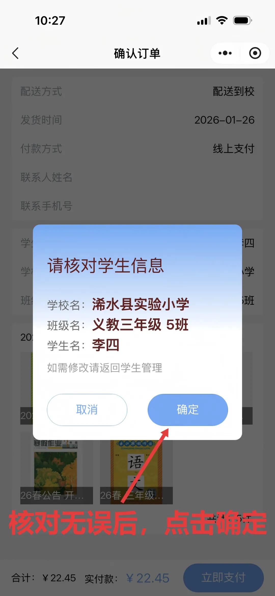 预售平台实行“一校一码”(或通过扫描小程序二维码进行),家长、学生扫码进入微信小程序后,确认在读学校信息,准确选择年级、班级,填写学生姓名。(身份证信息不用填写,如有同班同姓名的学生才必须填写),确保配送信息准确无误。如果填写错误,点击“预售”-“学生信息”-“解绑”,重新录入即可。