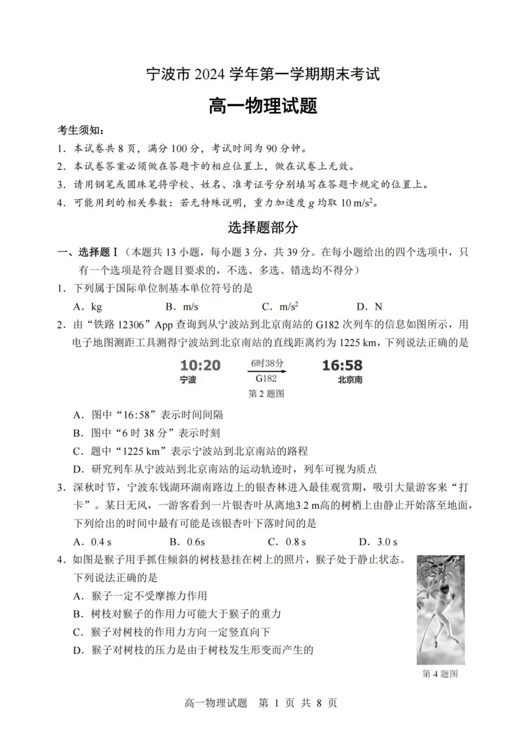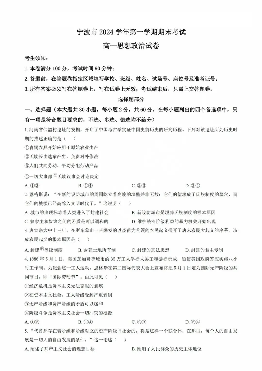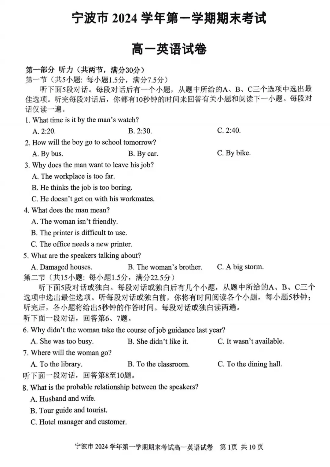 >学习资料|宁波市2024学年高一第一学期期末统一测试各科试题及答案汇总(内含下载链接)