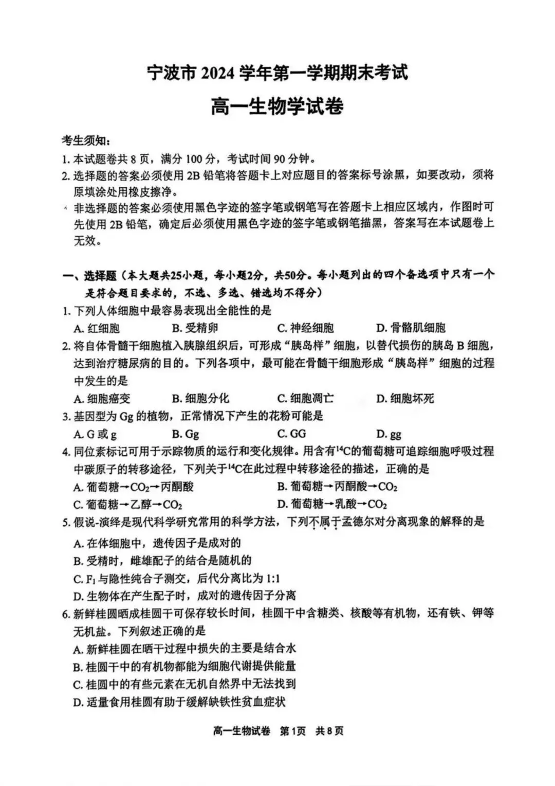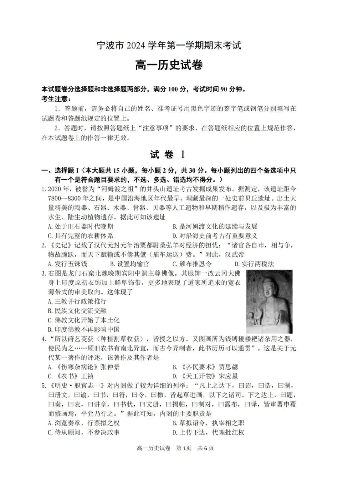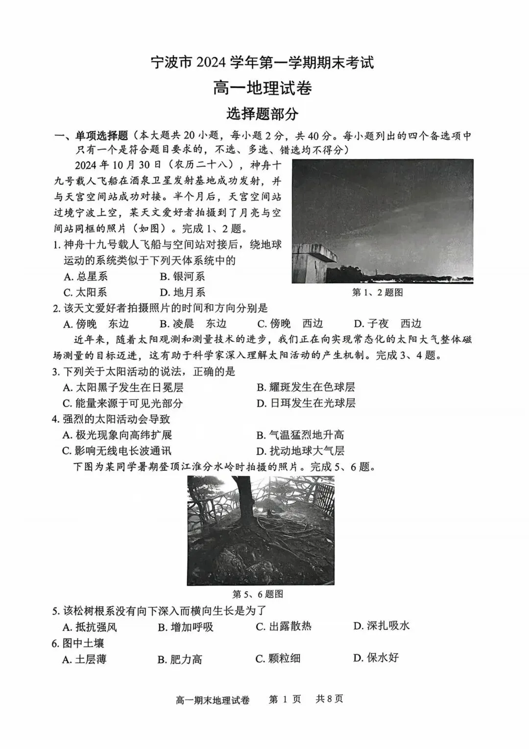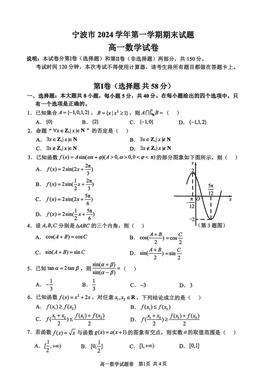 >学习资料|宁波市2024学年高一第一学期期末统一测试各科试题及答案汇总(内含下载链接)