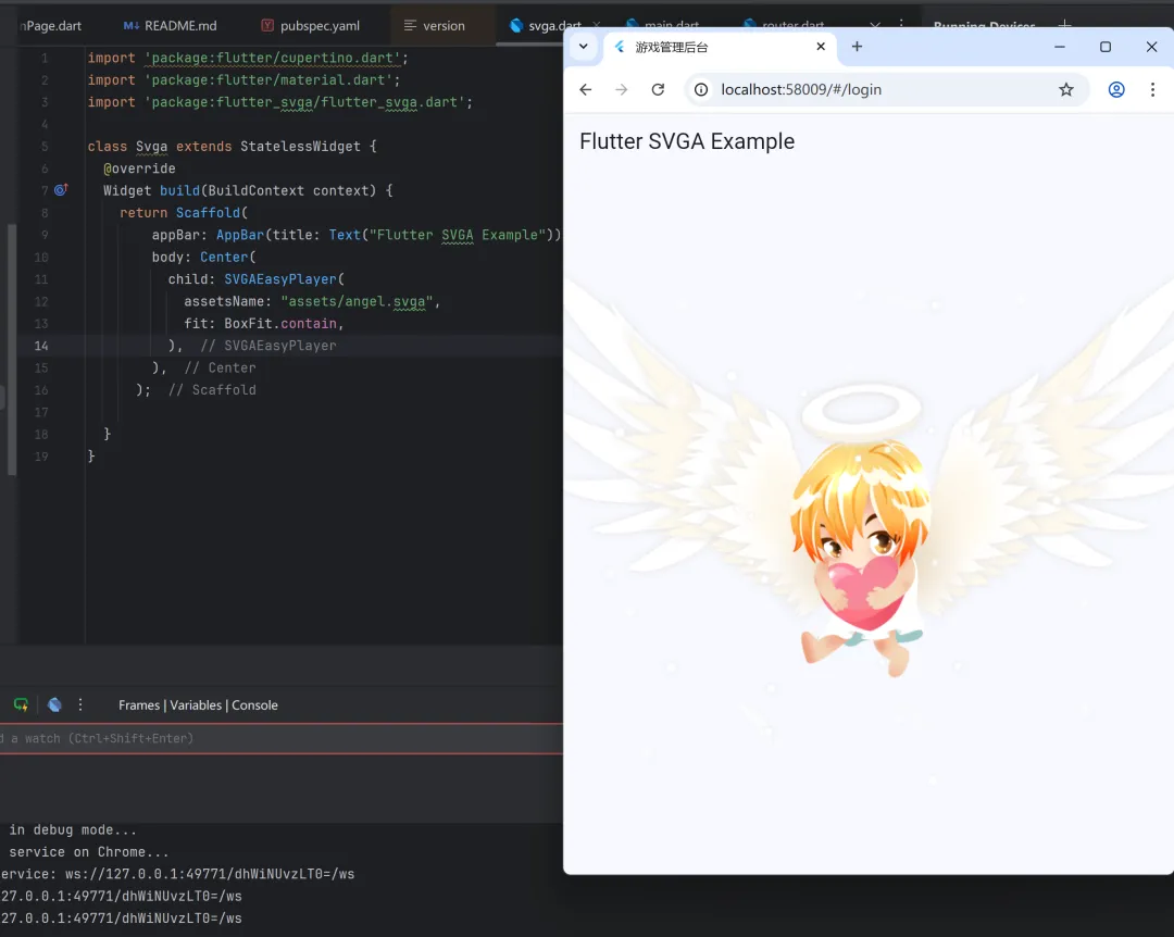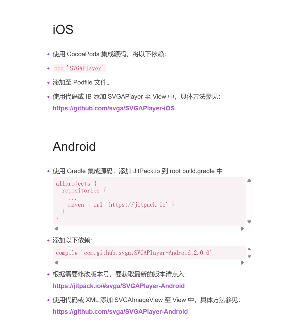 。 目前所实验的项目暂时没有用到这个库。生产还需谨慎对待。对于直播间礼物那些,这个svga的实用性自然不用多说。也是很多直播app会用到一个播放动画的方案。至于另外一个类似如PAG也是类似的动画,这个动画没怎么用过,实际上是腾讯系列的app会用得的一个动画方案。有社区版和企业版。 目前看只有Android 和ios 和web 版本支持,并没有看到flutter 版本。动画方案应该很多,svga播放是开源当中比较多公司用到一个库。android 和ios都支持。可以进行体验一下。当我去svga官网查看 flutter 的库的时候。发现仓库已经没有再维护了。更新力度好像没有新的,不知道为何这几个优秀的库没有更新了。有点可惜了。很多优秀的项目开发者很多是为爱发电,能不能挣到钱就不好说了。哪怕很多公司采用这些方案,开发者未必能从中受益。总体以上,都有很多可玩性高的动画库。国内好一些库,大厂会贡献一下社区,社区也会得到发展。而动画优化和播放似乎是一个高级开发必备面对问题。只不过上述的实验,并不是应用到实际商业产品去。今天抽空体验一下。曾经在一次交流过程中,听取其他开发者面对的实际问题。往往不是单纯这样播放一个动画那样简单了。还有更多是复杂的场景和渲染压力会面对的。有更多苛刻的条件。这个暂时没有实力去深入了。