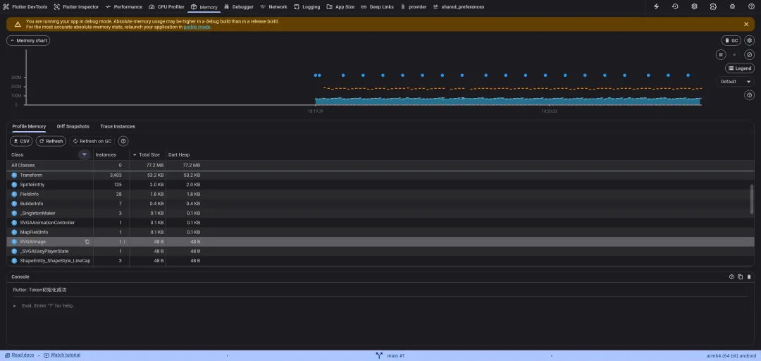 不过在安装的时候提示svga这个库的版本需要Dart的库在3.7.2 到4 之间。 而本地这个flutter 的sdk 是旧了一些。提示升级3.38.6 最新的sdk试试。(目前flutter的sdk 最新版是3.38.6)首先查看当前的版本,flutter --version在本地安装的包是3.35.7版本,再到官网查看一下这个版本信息。0.0.12的版本绑定了dart版本,要求3.10.4。这样一来发现电脑安装的版本没有升级到最新的版本。那样尝试降低一下svga的 flutter_svga: ^0.0.4版本,观察一下能否播放。使用官网的案例。下载一个svga的素材。似乎0.0.12 这个版本要求比较高。降低了版本后,安卓模拟器是能播放。同样真机也是能播放。单纯一个动画并不会出现什么卡顿情况。同时播放久就不好说了。观察一下工具提供的内存分析。在仓库当中,新版0.0.12这个库这个版本也有内存的问题反馈。只是想体验一下,这个库能否使用在生产中就不清楚。如果单纯只是播放1-2个动画 应该没什么大问题