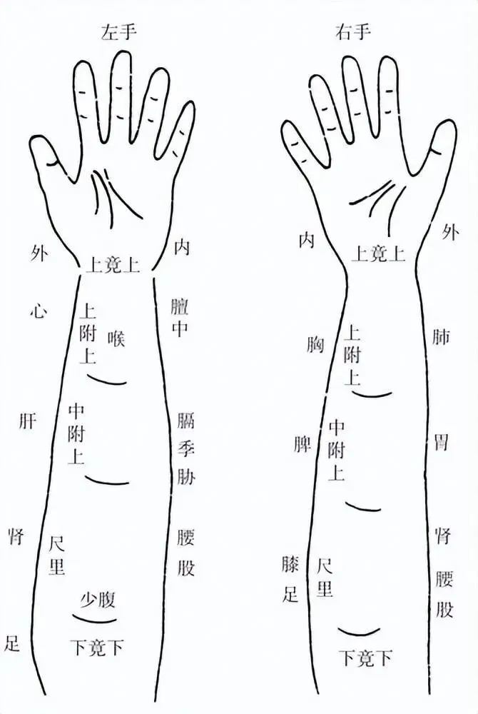 尺内两旁则季胁也,尺外以候肾,尺里以候腹中。附上左外以候肝,内以候鬲;右外以候胃,内以候脾。上附上右外以候肺,内以候胸中;左外以候心,内以候膻中。前以候前,后以候后。上竟上者,胸喉中事也,下竟下者,少腹腰股膝胫足中事也。