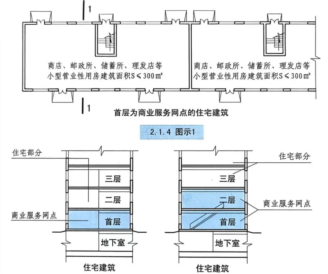 是指设置在住宅建筑的首层或首层及二层,每个分隔单元建筑面积不大于300m²的商店、邮政所、储蓄所、理发店等小型营业性用房,如图所示: