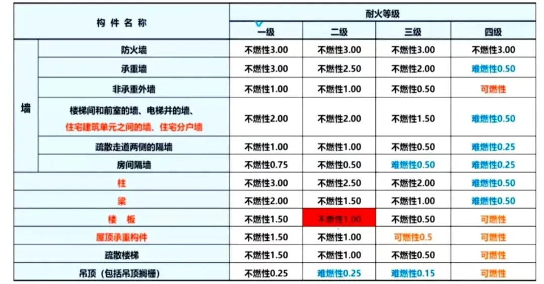 表5.1.2 不同耐火等级建筑相应构件的燃烧性能和耐火极限(h)