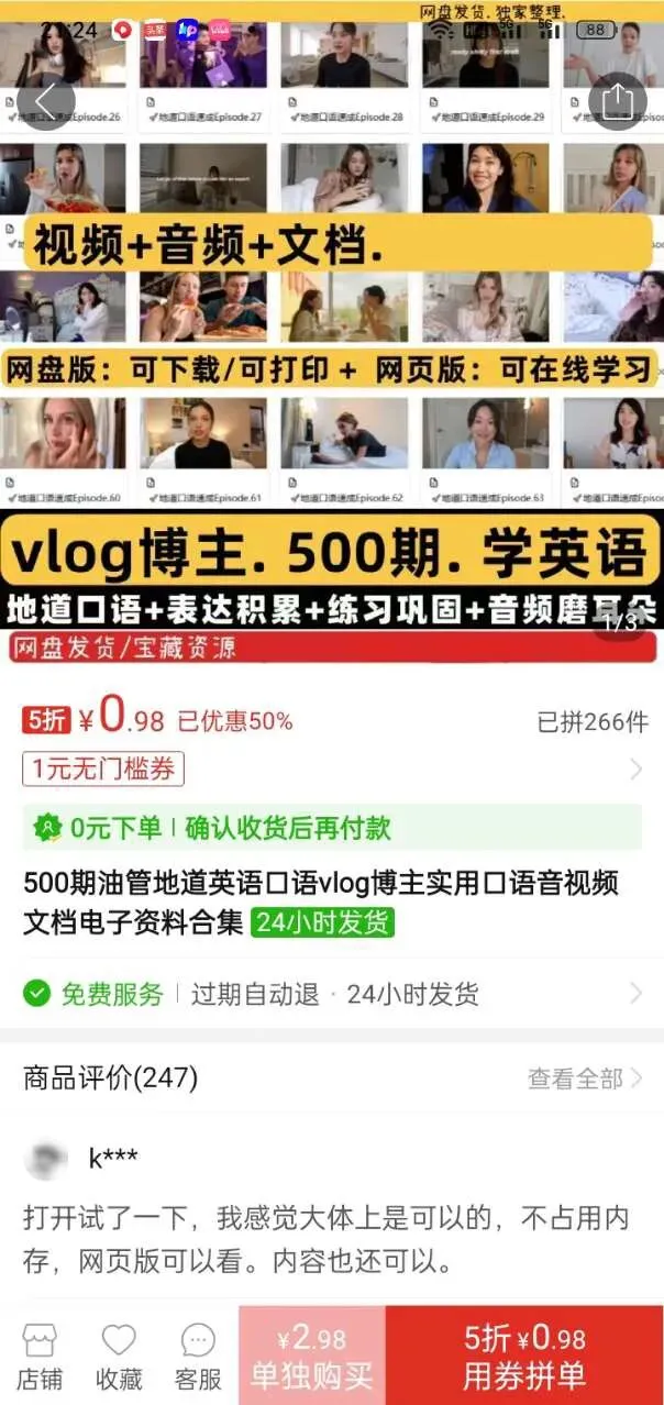 我去某多多搜下关键词“油管英语”,我找了一个销量不错的品,点进去一看,居然1块钱都不到!惊不惊喜?意不意外?
