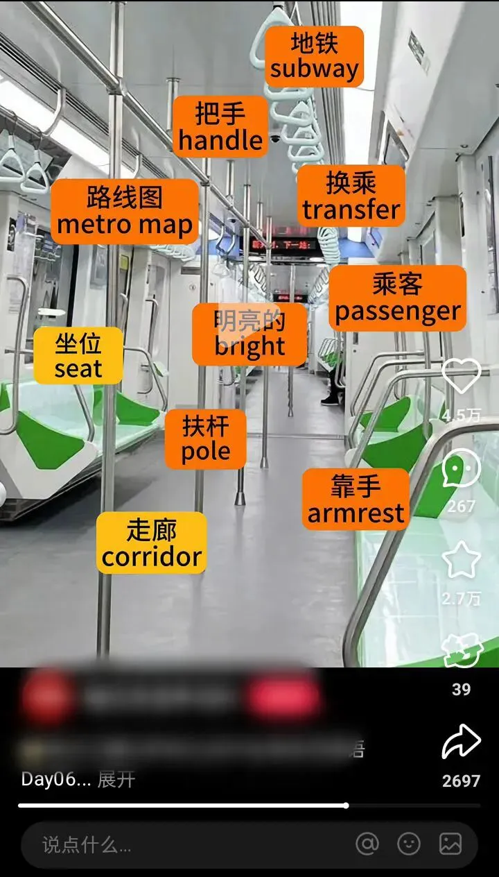 教日常生活英语,就真的拿着手机拍坐地铁的视频,每个地方标好中文和对应的英文,比如,地铁(subway)、把手(handle)、座位(seat)等等,这样会更容易记得。