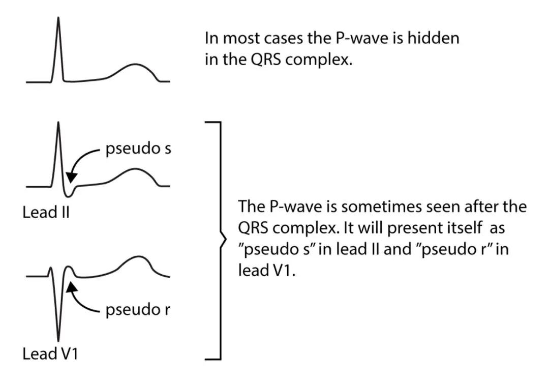 · 若可见,多为逆行P⁻波(在下壁导联II、III、aVF倒置)。