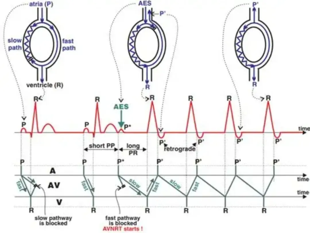 · 定义:AVNRT是最常见的室上性心动过速(SVT)类型之一,由房室结内或附近存在的快、慢两条路径形成的折返环路引起。