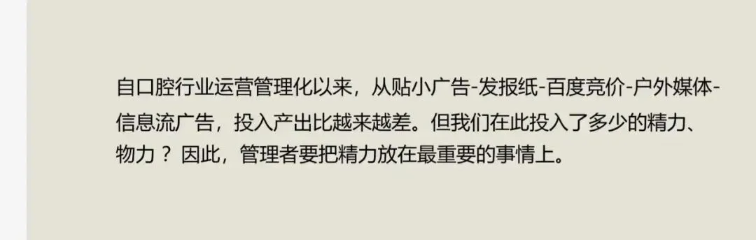 我们口腔行业自从运营管理化以来,最早以前像电线杆上贴一些小广告,后面又变成了一种发报纸广告。后面又到了一个时间叫百度竞价。再到户外媒体,然后到了现在这个时代就是信息流广告