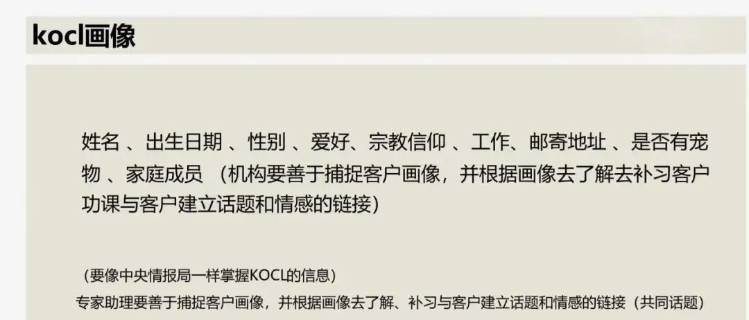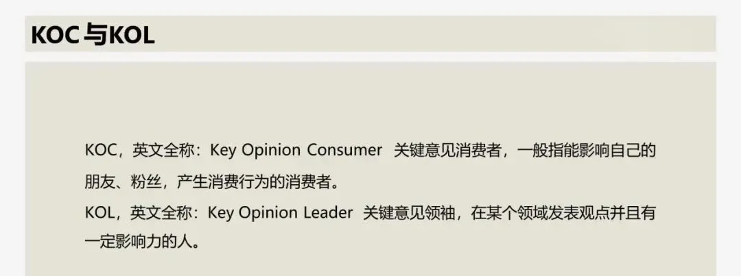 大家看一下这一页,我们讲叫一下KOC和KOL的概念。KOC的中文翻译过来叫关键意见消费者一般只能影响自己的朋友、粉丝产生消费行为的消费者。像我们朋友圈有很多的一些人发朋友圈,他影响的面不是很大,只是我们在朋友圈,包括我们很多的客户,他都是我们的KOC客户。KOL叫关键意见领袖,我相信大家都听说过,有很多的大v有很多的专家都算KOL。他在某一个领域发表观点,并且有一定影响力的人。