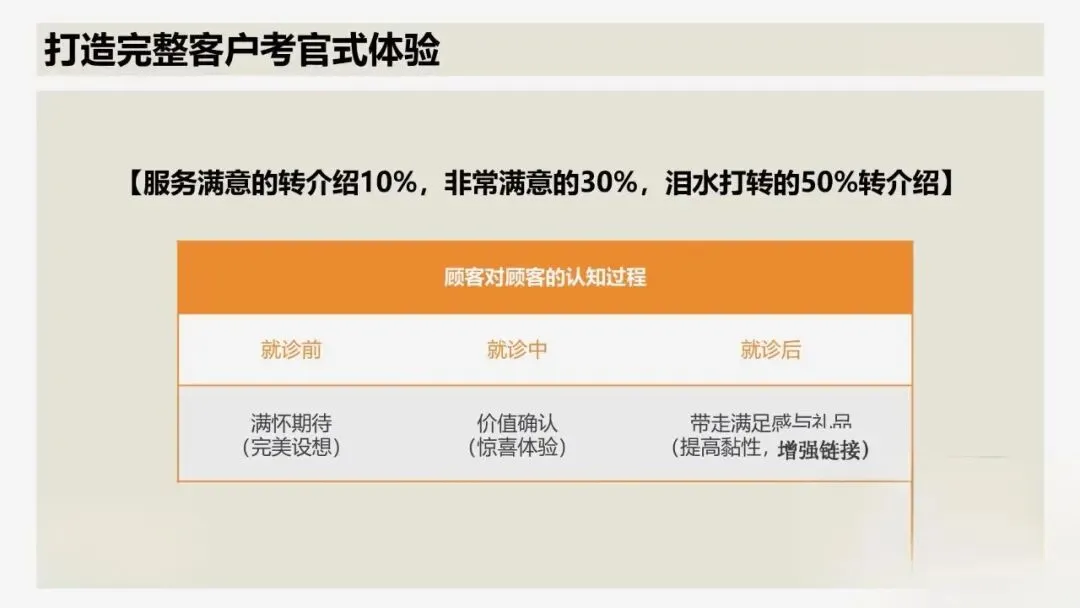 KOC和KOL两个逻辑理念我把它合并在一起做一个KOCL闭环模型,这对我们口腔门诊的运营非常重要。要形成这个闭环必须经历这4个过程:体验者、受益者、追随者、分享者。下面我一一讲解。首先是体验者:他必须是我们的患者。有一些渠道他会来找我,他说我这边有很多的资源,像银行或者保险公司。我想给你进行导流,然后你给我分成。我说不好意思,如果你不是我们的患者,我不去做这个事情。为什么?因为他对我们基本上不太了解,真正能够感知到我们好的人一定是在我们这边诊疗过,因为只有诊疗过他才亲自体验过。他在外面口若悬河说我们这家口腔机构非常好,但其实他的好其实未必能够打动人,所以说成为我们口腔机构的一个kocl他必须是我们的一个患者。第二个是受益者:他必须是一个受益者,这个受益者是怎么理解?他非常认可我们的人,非常认可我们的服务。他对我们的期望值。他对我们的认可度是非常高的。这种客户他在治疗之后他给你竖大拇指。他觉得非常好给你送锦旗,或者这样他就是受益者。第三个是分享者:分享者是什么?他曾经给我们转过介绍,他非常认可我们才转介绍。如果他没有给我们转过介绍,他成为不了COS。分享者有两种:第一种分享叫自然属性的分享(被动)。他想起来了他就分享,当别人提到口腔有问题的时候,他会分享,这是想起来就分享叫自然属性的分享。他是一种被动的状态,他不会主动去宣传,不会主动去宣传,所以说他的分享量是很小的,这个也是没有利益的分享,这个分享是我非常喜欢的分享。还有一种分享叫利益性的传播。这个是主动对他而言是有意义的。但我们要有KOCL闭环1234。就是为了避免他真正为利益而去驱动做很多事情,它必须在我们相互信任的基础之上,我们再通过利益去促进他,让他做更多的加法,利益性的分享传播,主动的是有目标的传播量,它就会很大。第四个是追随者:这个时候是精神层面一种升级,他对我们已经非常了解了,就形同跟我们的员工一样,跟我们的朋友一样,我们的每一个细节每一个点他都是非常了解,他是我们口腔机构非常忠实的粉丝,这个时候叫追随者。我说什么话患者他都会相信,并且他会极大的去践行,帮我们去转介绍,这个是精神层面的。最终它才会成为一个kocl。我做了一个认知过程,任何的患者他来到我们门诊之前,假如说预约或者别人介绍之类的,其实他的心理状态是一种叫满怀期待,完美设想的一种想法。他是满怀期待的,为什么?因为有人跟他说这边还不错,如果他不是转介绍的,有的人会说他自己预约的,他要去解决口腔的问题,他很疼了,或者他需要种植或者治疗类,他也是有这种期待的。