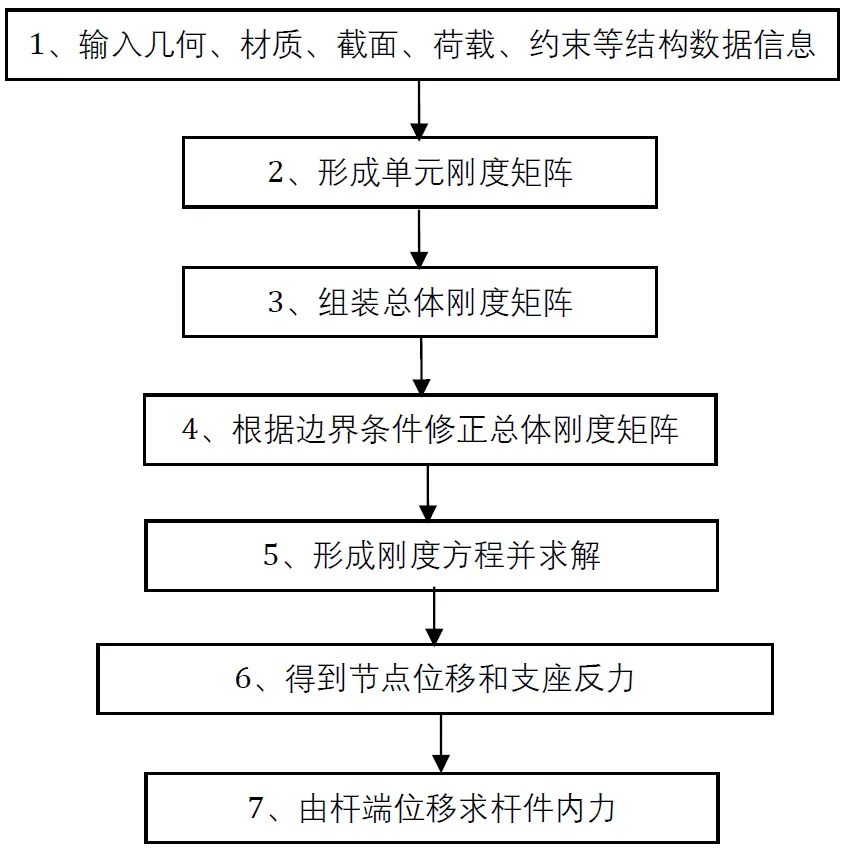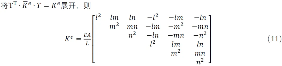 ,矩阵中的各数值用绿色表示。按下图所示,根据矩阵中的数值代表哪两个自由度的关系,“送入”总体刚度矩阵相应位置,在同一位置有多个元素式,将多个元素相加,即可得到总体刚度矩阵。如果结构的总自由度数量为nf,则总体刚度矩阵的维数为nf×nf。按照以上方法组装的总体刚度矩阵是奇异的,即方程K∙U=0,U有非零解,其物理意义为结构仅平移时,节点力向量为零。实际结构由于有约束,结构的总体刚度矩阵非奇异。为反映约束对结构总体刚度矩阵的影响,程序设计时常采用“充大数”法修正刚度矩阵。在式(12)的刚度矩阵中,如节点i的x向位移被约束,可认为此自由度对应的刚度为无穷大,将ix行ix列位置的元素数值改成一个大数,如1e10,即代表刚度无限大,相当于被约束,这种做法的好处是结构刚度矩阵规整,利于编程。网架结构受约束的自由度对应的节点外荷载(即支座反力)未知,但位移已知(本文仅讨论刚性支座),即为零;未受约束自由度对应的外荷载已知,但位移未知。这样对于有nf个自由度的结构,总共有nf个未知数,nf个方程,解线性方程组可求出唯一解。第5步求得的nf个未知数的解,一部分为受约束自由度对应的支座反力,一部分为未受约束的自由度对应的节点位移。求得杆件整体坐标系中杆件节点位移后,杆件轴力按下式计算,拉力为正,压力为负。本文介绍了网架结构的静力计算理论,包括单元刚度矩阵的计算、总体刚度矩阵的组装、根据边界条件修正总体刚度矩阵的方法、以及杆件位移、内力及支座反力的计算方法。DS公众号,敬请关注