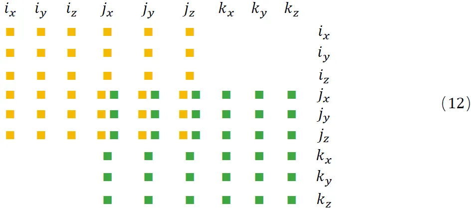 ,矩阵中的各数值用黄色表示;节点j,k之间有杆单元,其相应的单元刚度矩阵为