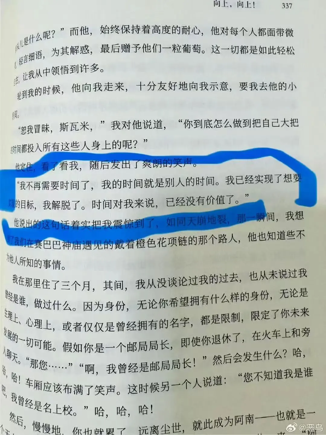 -“所以我个人感觉这对于我个人来说也是一种精神上的解放吧,因为以前我感觉我从大概几年前开始就有很强的身份认同危机,一直不知道自己是谁。不知道自己人生的价值是什么,不知道该往哪个方向去,那这种精神上的迷茫和战略上的缺失带来的痛苦和走的弯路要远远比不努力本身要大的多的多。所以其实我倒是觉得回头望去,今年的我,应该是现在至少是我现在人生中最幸福的时刻了,但我希望越过越幸福啊,现在我觉得也是人生中最幸福的时刻,并不是因为我觉得我赚取得了一些社会上认为的成功,我觉得这都不重要。最核心的重要还是我解决了最根本的身份认同焦虑问题,以及知道自己是个什么人。愿意为一个什么事情奋斗终身,愿意做一件事情。”——这是他在一周年完结时候的结束语。我听到这一段的时候正走在42街,前面是巨大的时代广场广告牌,走在路上我从未觉得如此轻盈