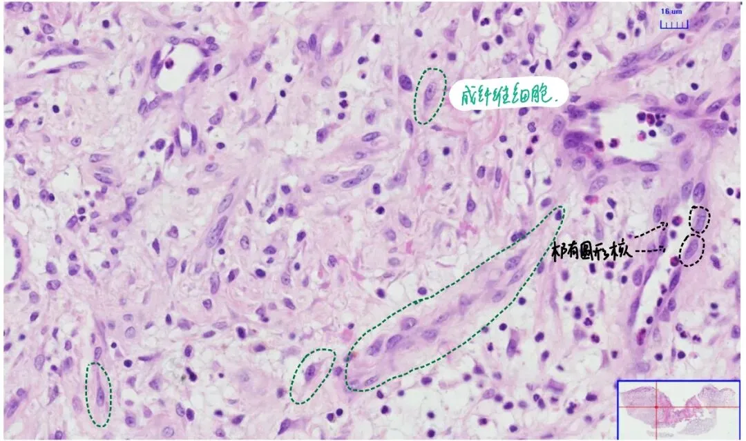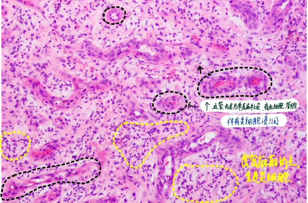 1、镜下可见大量由内皮细胞增生形成的实性细胞索及扩张的毛细血管,对着创面垂直生长,并以小动脉为轴心,在周围形成袢状弯曲的毛细血管网;