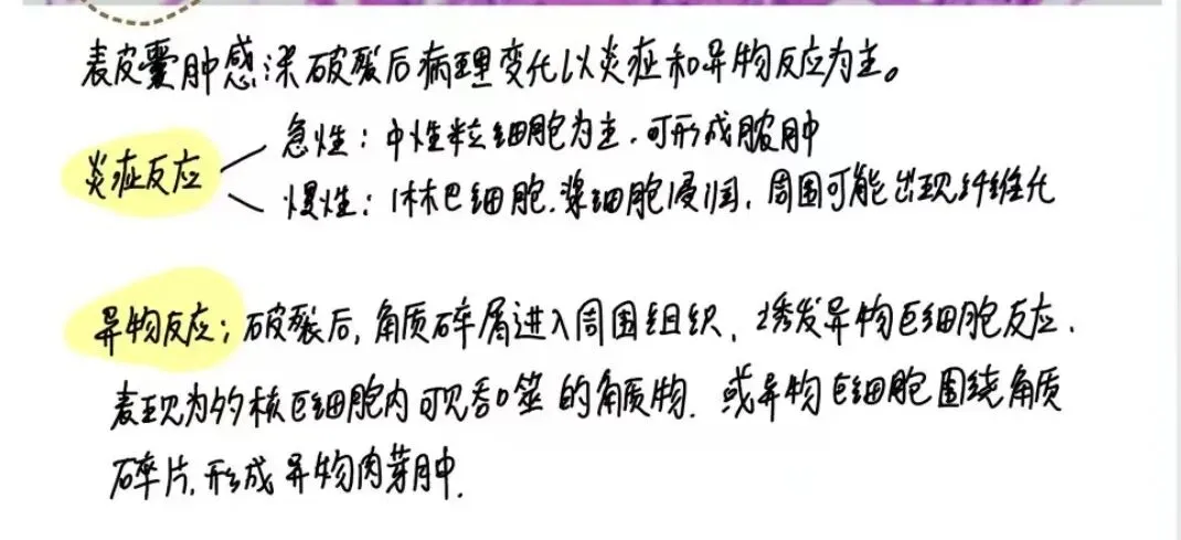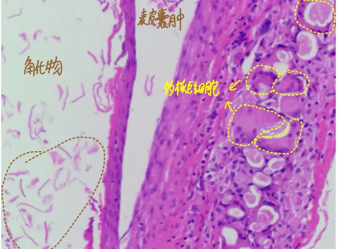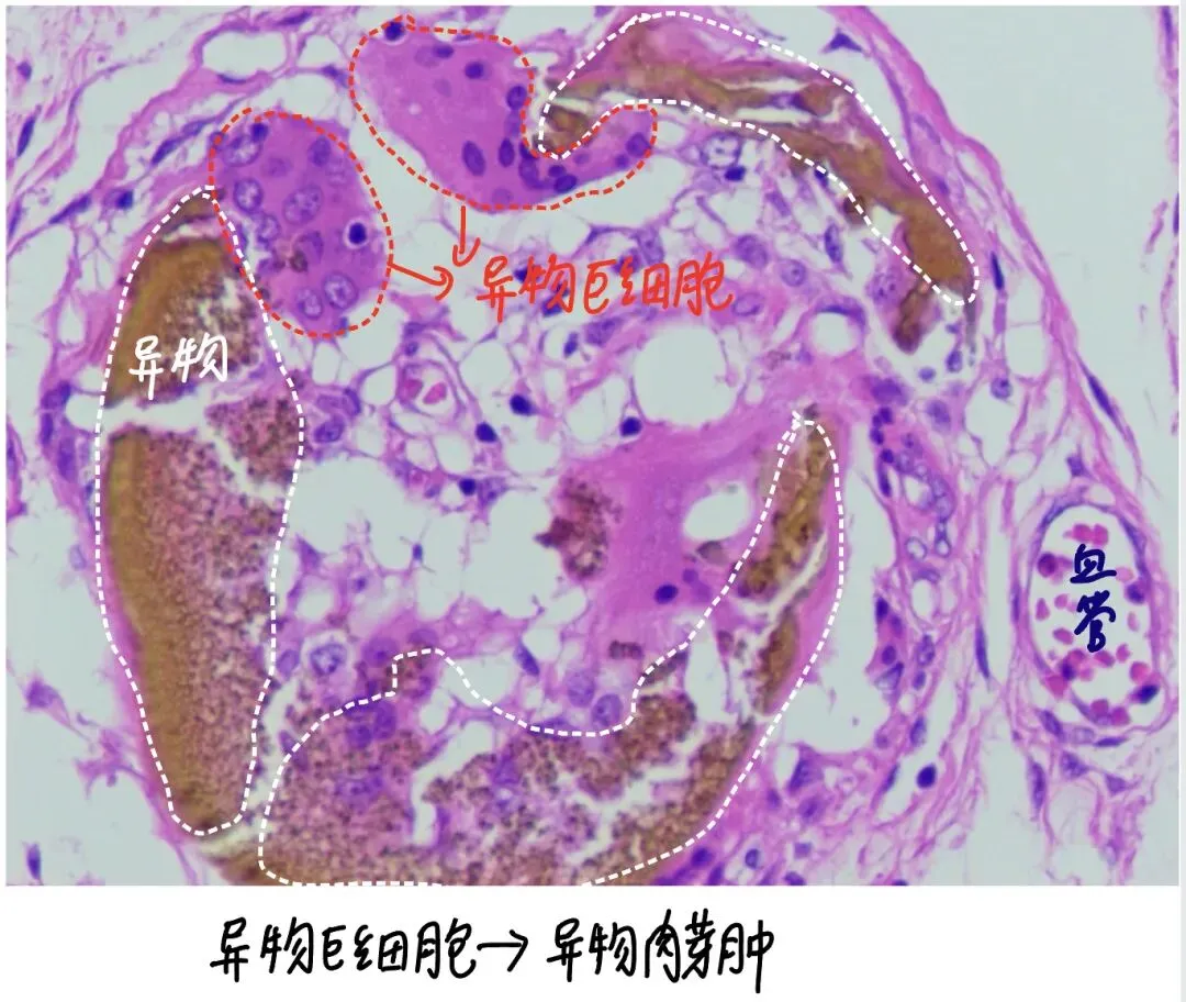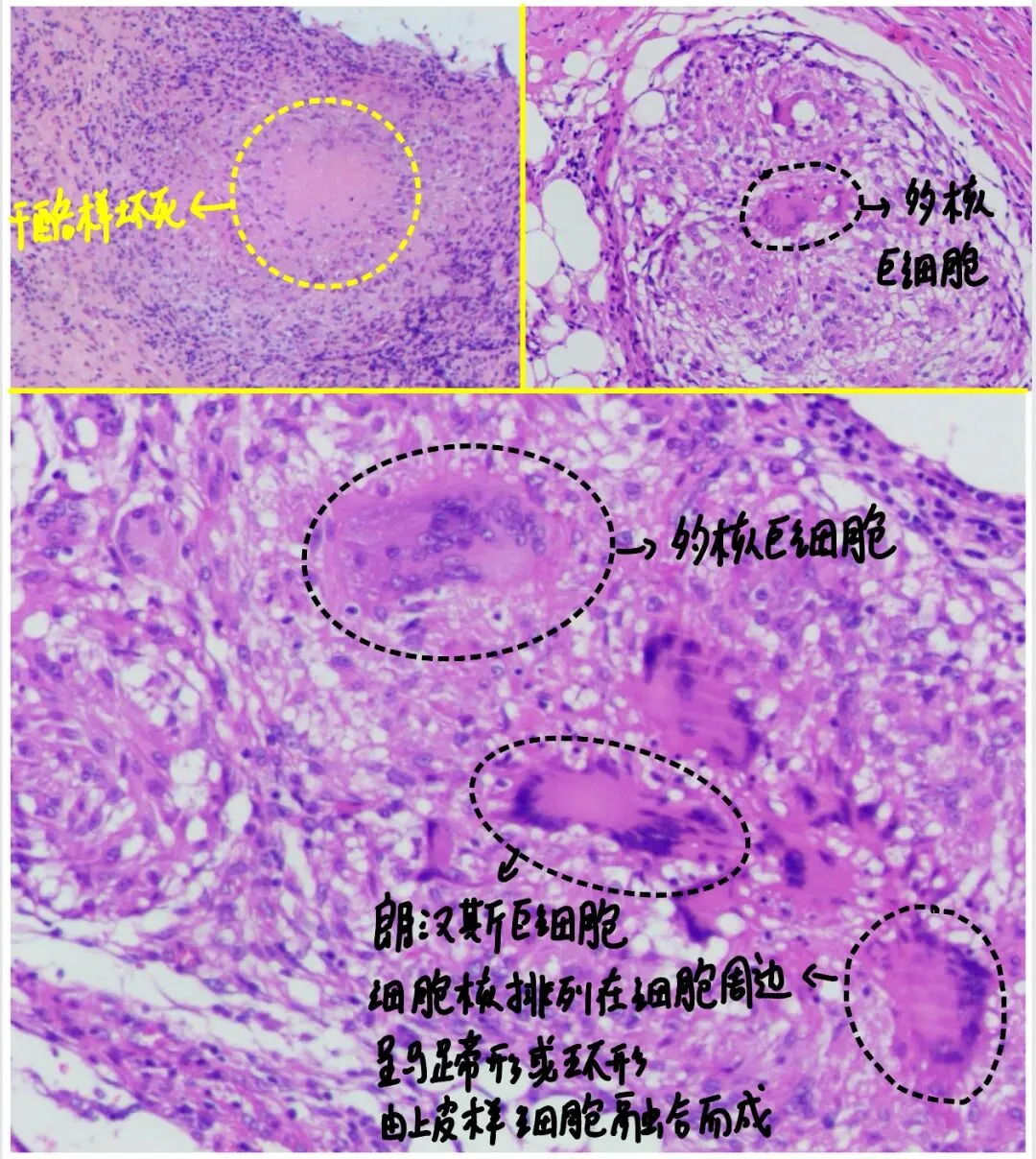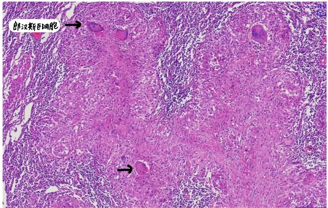多核巨细胞还常见于不易消化的较大异物、组织中的角化上皮和尿酸盐等周围,细胞核杂乱无章地分布于细胞,又称异物多核巨细胞;异物性肉芽肿的中心为异物,周围为数量不等的巨噬细胞、异物多核巨细胞、淋巴细胞和成纤维细胞等,形成结节状病灶。总结一下:巨噬细胞转化成上皮样细胞 → 巨噬细胞或上皮样细胞融合 → 形成多核巨细胞 → 其中一种(朗汉斯巨细胞)的细胞核排列成马蹄环样,理解就是朗汉斯巨细胞是多核巨细胞的一种类型,主要见于特定的感染性或免疫性肉芽肿疾病,比如提示结核等疾病;