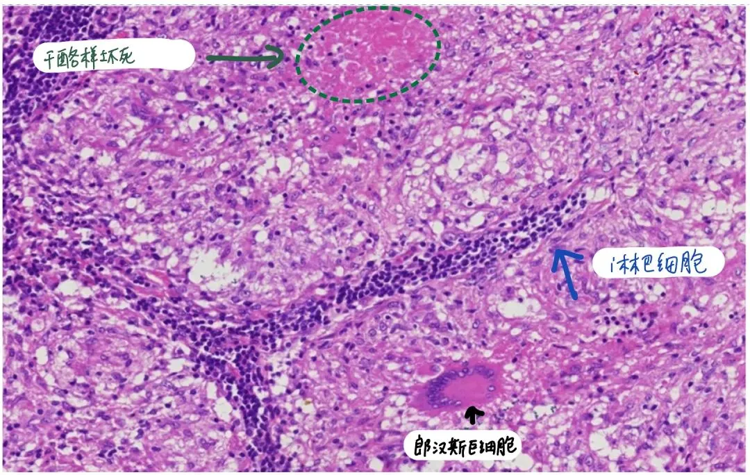 结核可见干酪样坏死、上皮样细胞、朗汉斯巨细胞、淋巴细胞浸润。