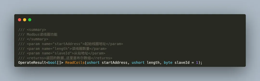 按照这个报文格式, 可以把读线圈功能方法设计成这样