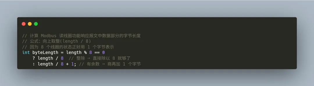第四步是验证返回报文, 可以验证返回报文长度是否正确, 从从站的响应报文可以发现, 返回报文的固定字节数是5, 然后数据段是根据读的线圈数量来决定返回几个字节