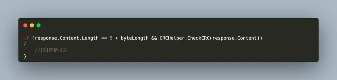 还可以验证返回报文的CRC校验码是否正确, 结合上述两个验证条件都成立, 就可以进行解析报文