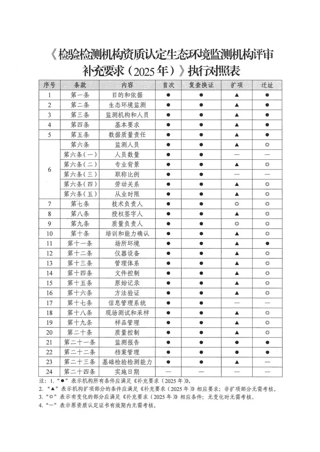 内容:监测机构和人员,首次、复查换证、迁址时所有条件应满足《补充要求(2025)》。扩项时扩项部分的条件应满足《补充要求(2025)》相应要求,非扩项部分无需考核。