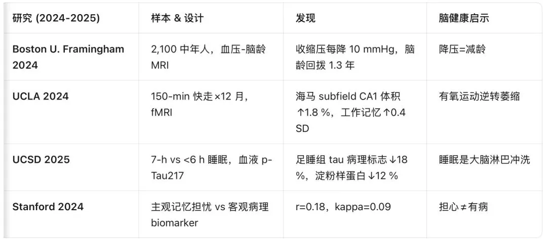 2. 主观记忆担忧与真实病理相关性极低(r≈0.18),客观指标(处理速度、HRV、血压)更可信;