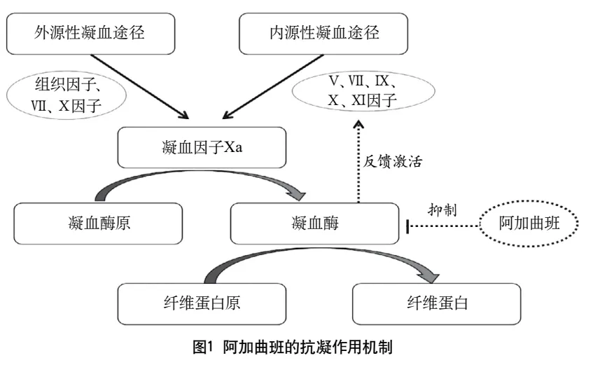 阿加曲班是一种直接的凝血酶抑制剂,对游离的或与血块结合的凝血酶活性均可抑制。该药不依赖于抗凝血酶且不被丝氨酸蛋白酶所降解,可高度选择性地与凝血酶完全可逆性结合(抑制指数Ki值约39 nm)并灭活其酶活性,进而抑制由凝血酶催化或诱导的反应,包括纤维蛋白形成、凝血因子(Ⅴ因子、Ⅷ因子和ⅩⅢ因子)活化、蛋白酶C的活化以及血小板聚集,从而发挥其抗凝作用(图1)。此外,阿加曲班还有抗炎和抗病毒等抗凝以外的药理作用。