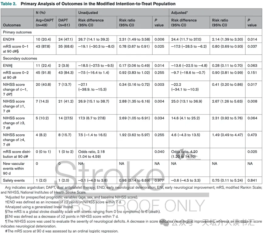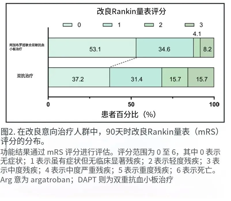 多中心 RCT(Stroke, 2025):在 4 家中心招募、入组标准为 BAD、NIHSS ≤5、发病 48 小时内给予阿加曲班 + DAPT vs DAPT 的随机对照试验中,阿加曲班组 END 发生率显著低于对照,90 天 mRS 结局也更佳,且短程用药下 sICH 率无显著上升。