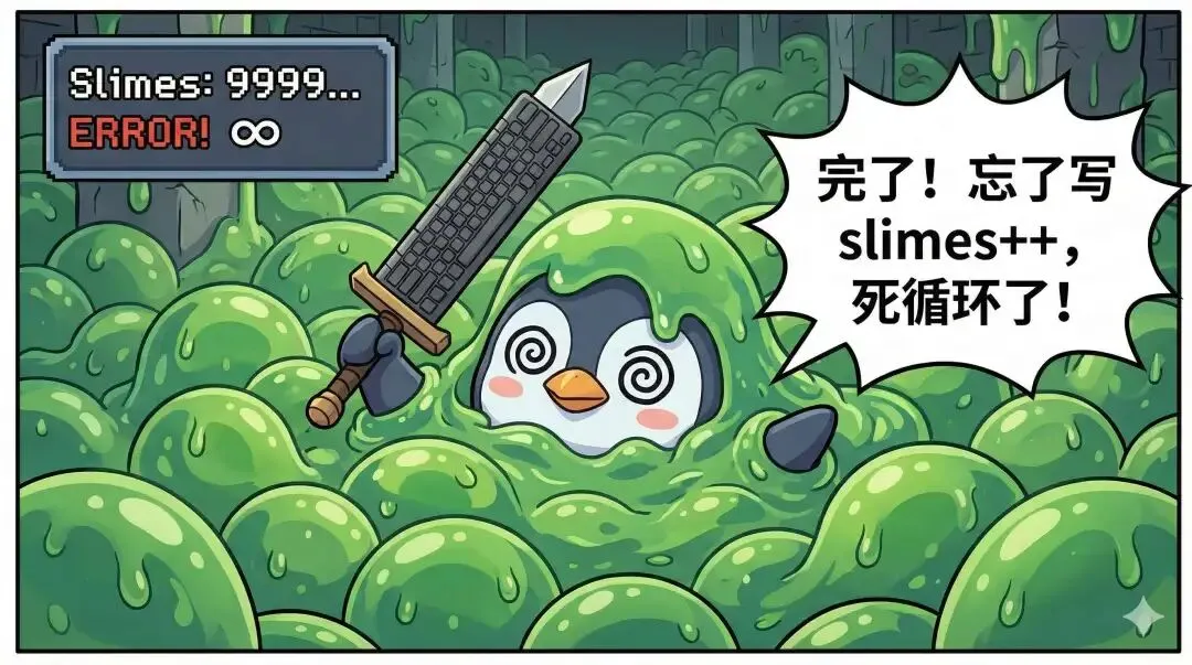 ⚠️ 踩坑警示: 如果忘记写 slimes++,条件永远成立,程序就会陷入死循环 (Infinite Loop) ,被困在时间循环里,跑到累死也出不来!