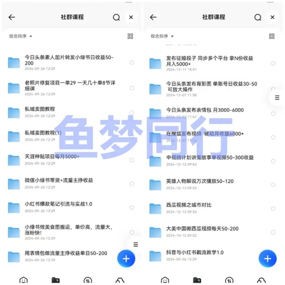 鱼梦同行社群每个月都会分享4-6个我们自己亲测的、靠谱的、能落地实操的项目。比你在外面做的那些乱七八糟的项目强多了,好好在群里沉淀一下,也不用到处被割了。