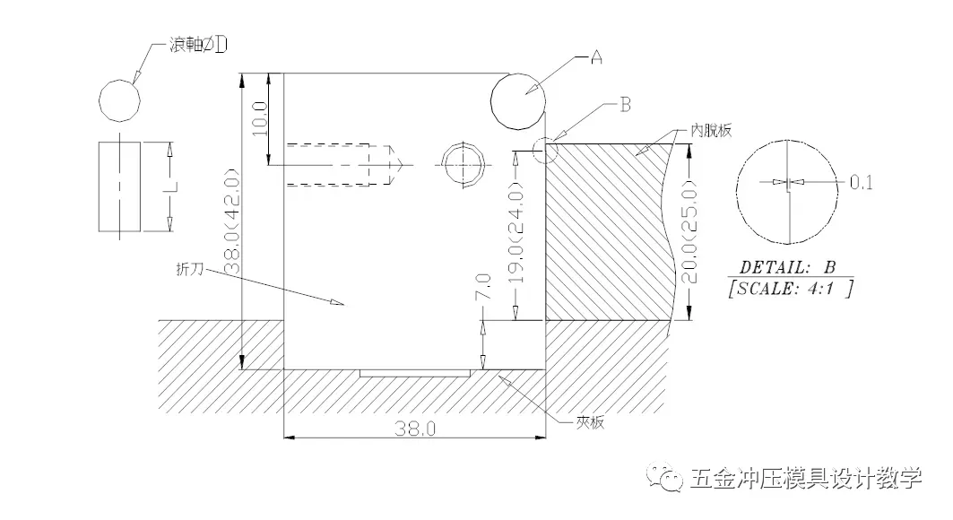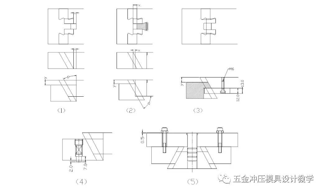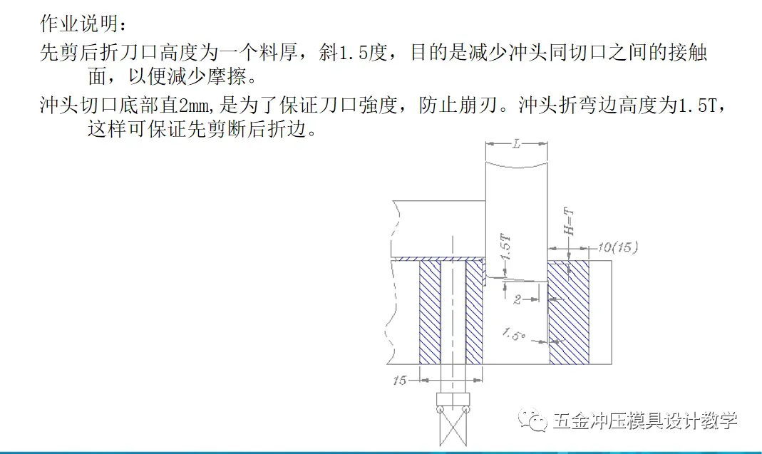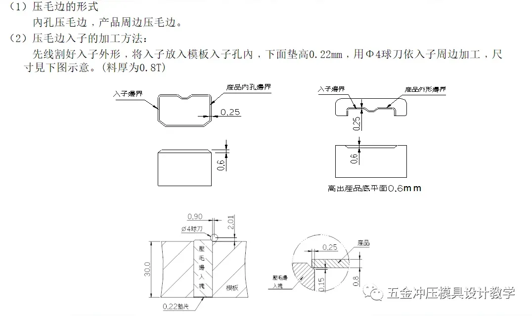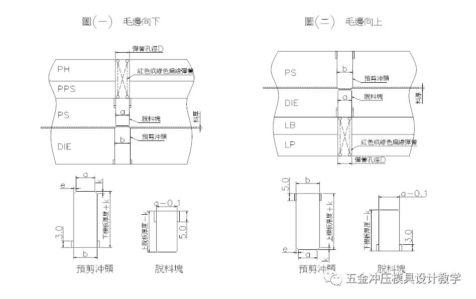 设计时﹐先要判定毛边的方向﹐确定预剪在上模还是在下模﹐其结构及具体设计尺寸如下﹕