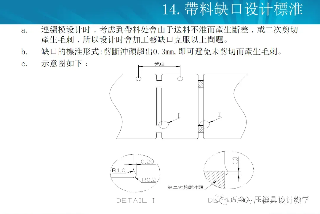 连续模带料部分在最后一站剪切或剪断成形﹐产品要求外观或手可触摸处均无毛边﹐因此要求模具在剪切的前一站进行预剪(也称为预压毛边)。