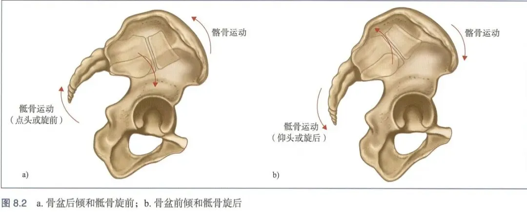 第一种方法是骶骨点头运动,这是通过骶骨基底部向前旋转或髂骨向后旋转实现的(图8.2a)。