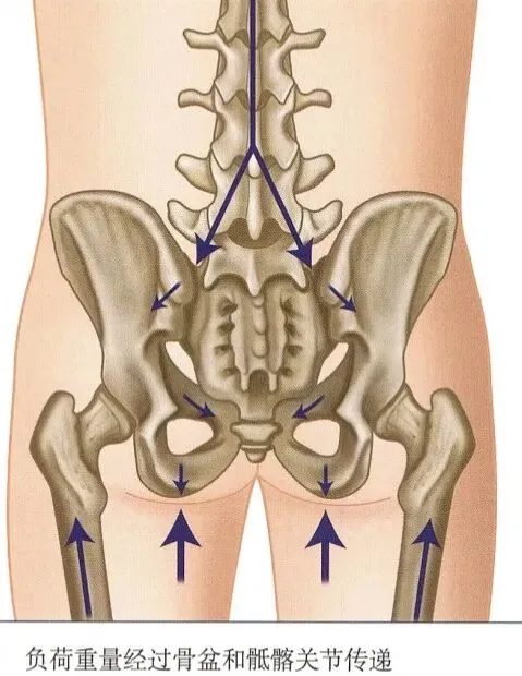 骶髂关节能够传递较大的负荷,且它的形状也适于实现这项功能。骶髂关节的关节面相对平坦,有利于传递压缩力和进行屈曲运动。然而,一个相对平坦的关节也容易受到剪切力的影响,骶髂关节可通过以下三种方式避免受到这些力的影响:
