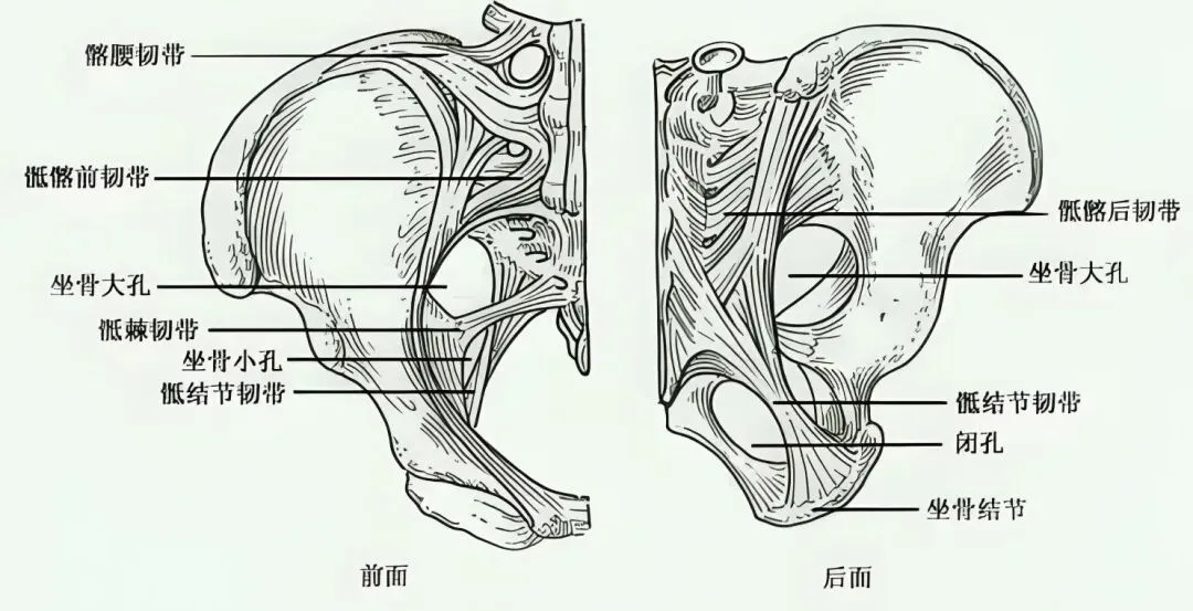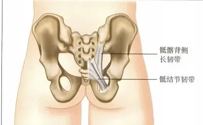 ①骶结节韧带,连接骶骨和坐骨,被称为“关键韧带”②骶髂背侧长韧带,连接 S3~S4 到髂后上棘,也称骶髂后韧带。
