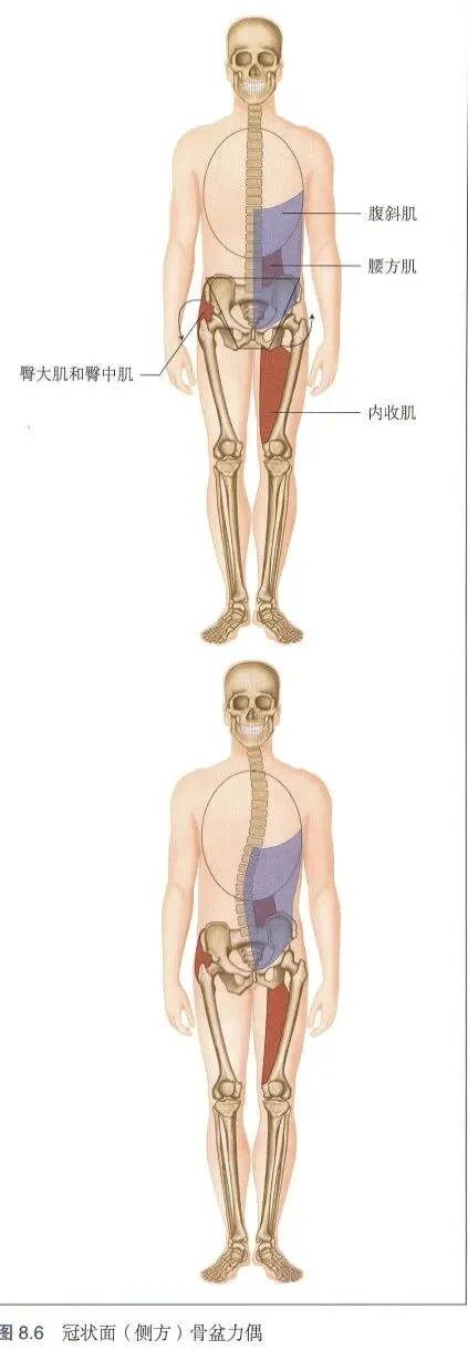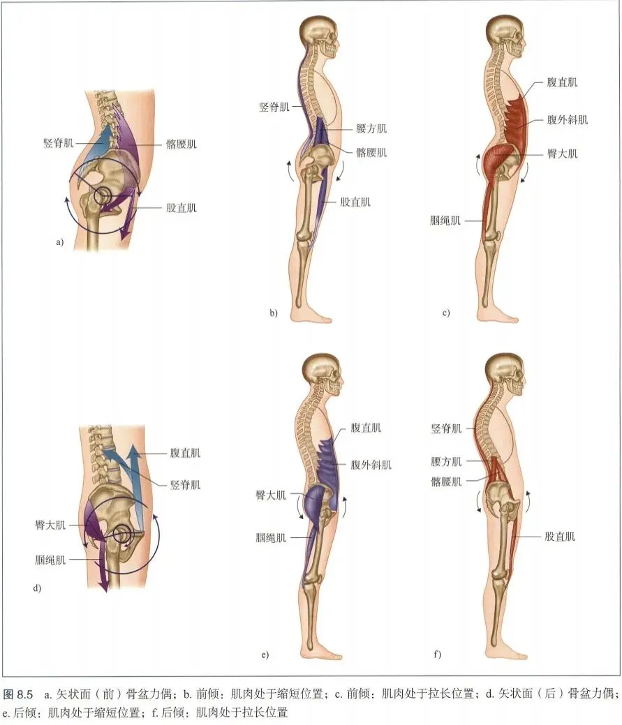 由潜在肌肉系统失衡引起的任何骨盆位置的改变都会对运动链的其余部分产生影响,这种生物力学的改变随后会影响骨盆与上肢的力学关系。有几对力偶负责维持骨盆的正确位置和对齐。图8.5a~f 和图8.6展示了力偶在矢状面和冠状面对骨盆的控制。