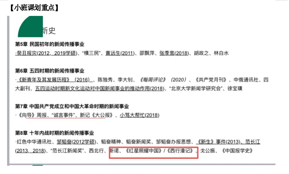 第五题:这道题考察的是新闻史哦,前两年都没有真题都没有新闻史的内容,今年放在名词解释考察也是可以预料的,《西行漫记》是考过两次的原题,在新闻史中也算是重点内容,我们上小班课时也划过重点哦,宝子们需要完全掌握得分点~