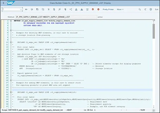 在传统MRP和MRP Live中应实施不同的BAdIs,因为传统MRP代码主要基于ABAP,而MRP Live基于SAP HANA存储过程。在某些情况下,MRP Live需要使用传统MRP逻辑(以ABAP编写)来计划物料;因此,如果一家公司正在使用MRP Live,在某些情况下,必须同时实施一个高级数据库过程(AMDP)业务添加项和相应的ABAP业务添加项,且逻辑相同。为了尽量减少这种情况,SAP S/4HANA 2022引入了新的PPH_SUPPLY_DEMAND_LIST AMDP业务添加项(供应需求列表修改),这是一个特殊情况,因为在传统MRP运行期间、MRP Live运行期间、MRP评估事务中以及MRP驾驶舱应用程序中都会调用它。当从数据库中读取计划元素时会调用此业务添加项,可以添加自定义逻辑来添加、隐藏或更改计划元素;使它们与MRP无关;或者将它们添加到MRP评估事务和SAP Fiori应用程序中。在实施此业务添加项时,需要格外小心,因为所实施的任何自定义逻辑都将直接影响MRP结果。例如,如果您使用此业务添加项使特定的销售订单类型与MRP无关,系统将不会创建计划订单来满足这些需求,最终可能会导致短缺。SAP为此业务添加项提供了一个示例实施类(见上图),其中的示例可用于以下需求:- 删除特定存储地点下的MRP元素,以模拟从MRP中排除的存储地点。