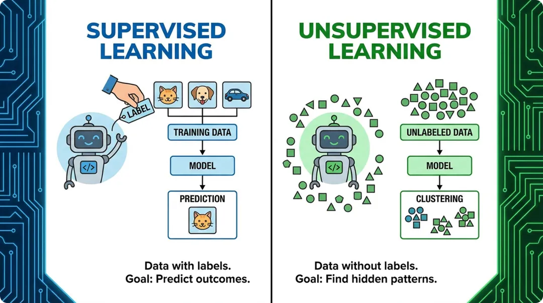 学到这里,我也在思考为什么会存在这两种截然不同的训练方式?我认为这与现实世界中数据获取的成本和场景有关。在某些领域(如医疗诊断、法律文书分类),我们可以获得专家标注的高质量数据,此时监督学习效果最佳;而在另一些场景(如用户行为分析、市场细分),数据量大但标注成本极高,无监督学习就成为了更经济的选择。
